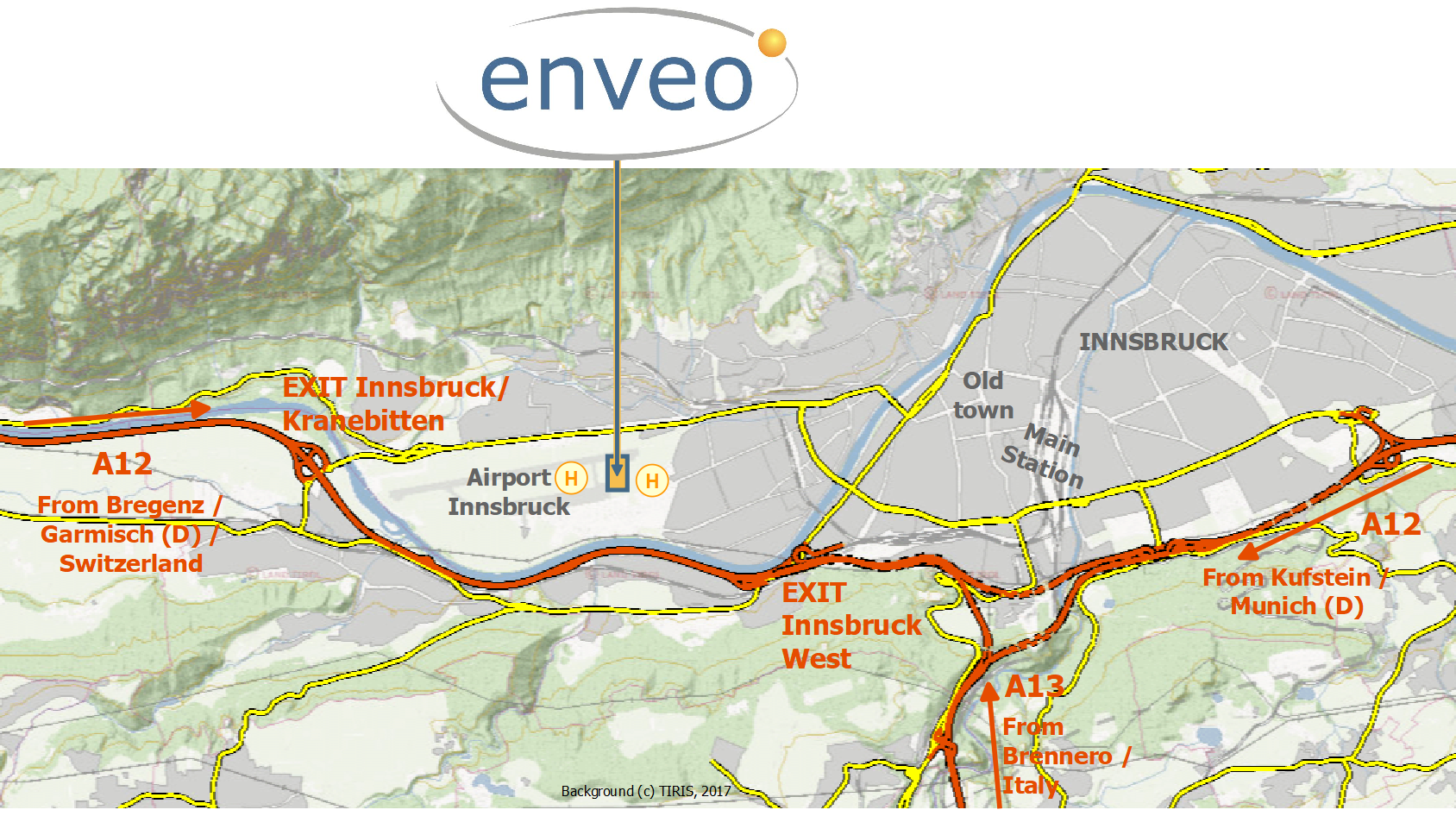 Exit the motorway A12 at Innsbruck West or optionally Innsbruck Kranebitten. Follow the signs towards the airport (Flughafen) of Innsbruck. Just a few meters before the airport, on the right hand side, the ENVEO office is located in the first floor of the black building with the inscription "Tyrolean".