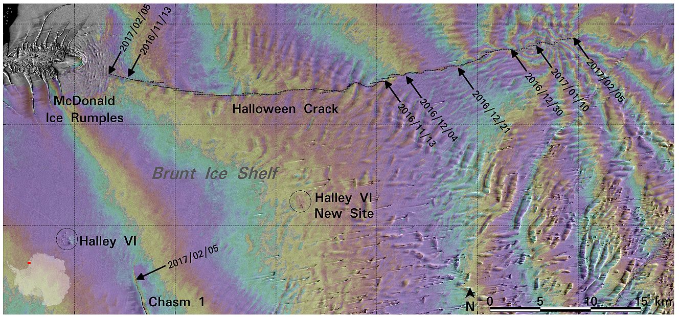 ENVEO analyses time series of Sentinel-1 and Sentinel-2 images since November 2016 to track the development of the "Halloween Ice Crack" on the Brunt Ice Shelf, near the British Halley VI research station in Antarctica.